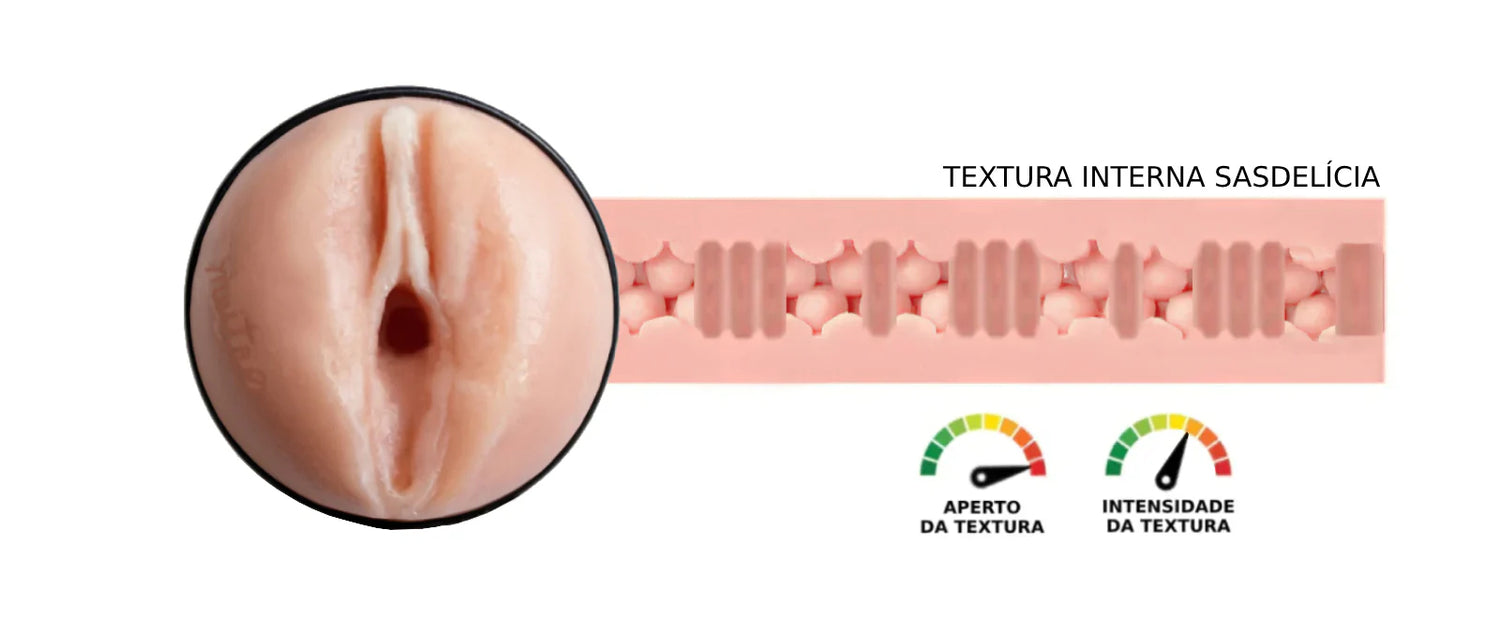 Desenvolvida especialmente para o produto Garota Vulvalia - Maitê Sasdelli, a textura interna SASDELÍCIA apresenta um canal apertado e com câmaras alternadas. O usuário desfrutará de bolinhas e espirais intercalados, estes artefatos visam maximizar a experiência sensorial e o prazer a cada penetração.
