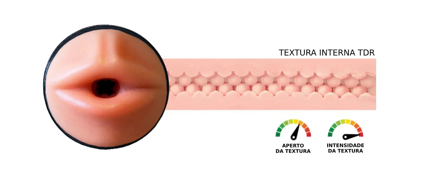 TDR é feito com o nosso material exclusivo SUPERPELE®, que imita perfeitamente a pele humana. Sua textura interna ultrassensível conta com bolinhas por todo o percurso do canal de penetração, elevando ao extremo a sensação de prazer.
